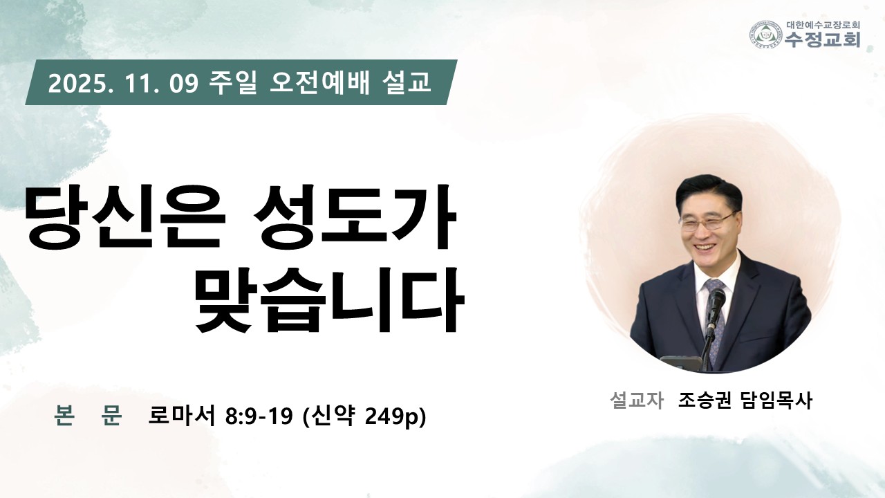 | 2025.11.09 창원수정교회 주일 오전 예배 담임 목사님 설교 말씀 | 조승권 목사님 | 2025-11-09 | |||