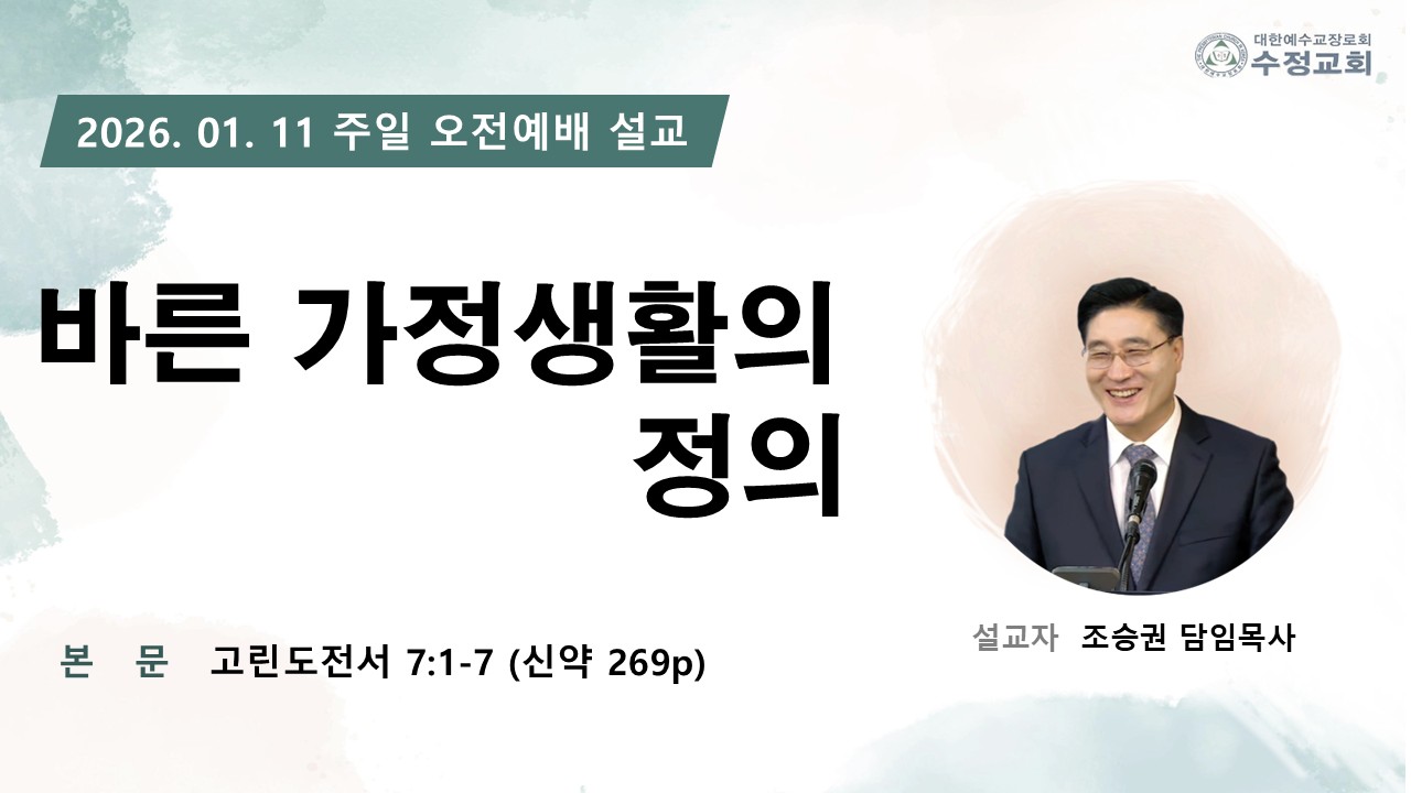 | 2026.01.11 창원수정교회 주일 오전예배 담임 설교 말씀 | 조승권 목사님 | 2026-01-11 | |||