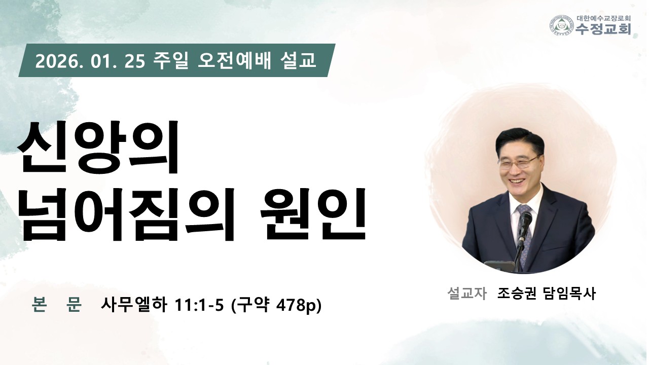 | 2026.01.25 창원수정교회 주일 오전 예배 담임 목사님 설교 말씀 | 조승권 목사님 | 2026-01-25 | |||