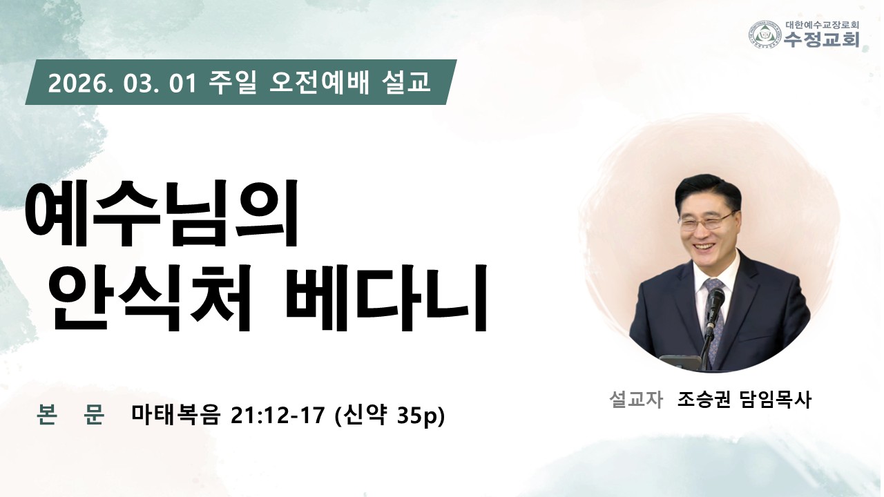 | 2026.03.01 창원수정교회 주일 오전 예배 담임 목사님 설교 말씀 | 조승권 목사님 | 2026-03-01 | |||
