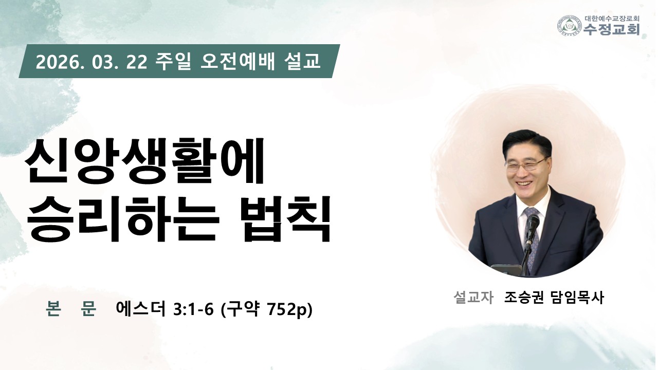 | 2026.03.22 창원수정교회 주일 오전 예배 담임 목사님 설교 말씀 | 조승권 목사님 | 2026-03-22 | |||