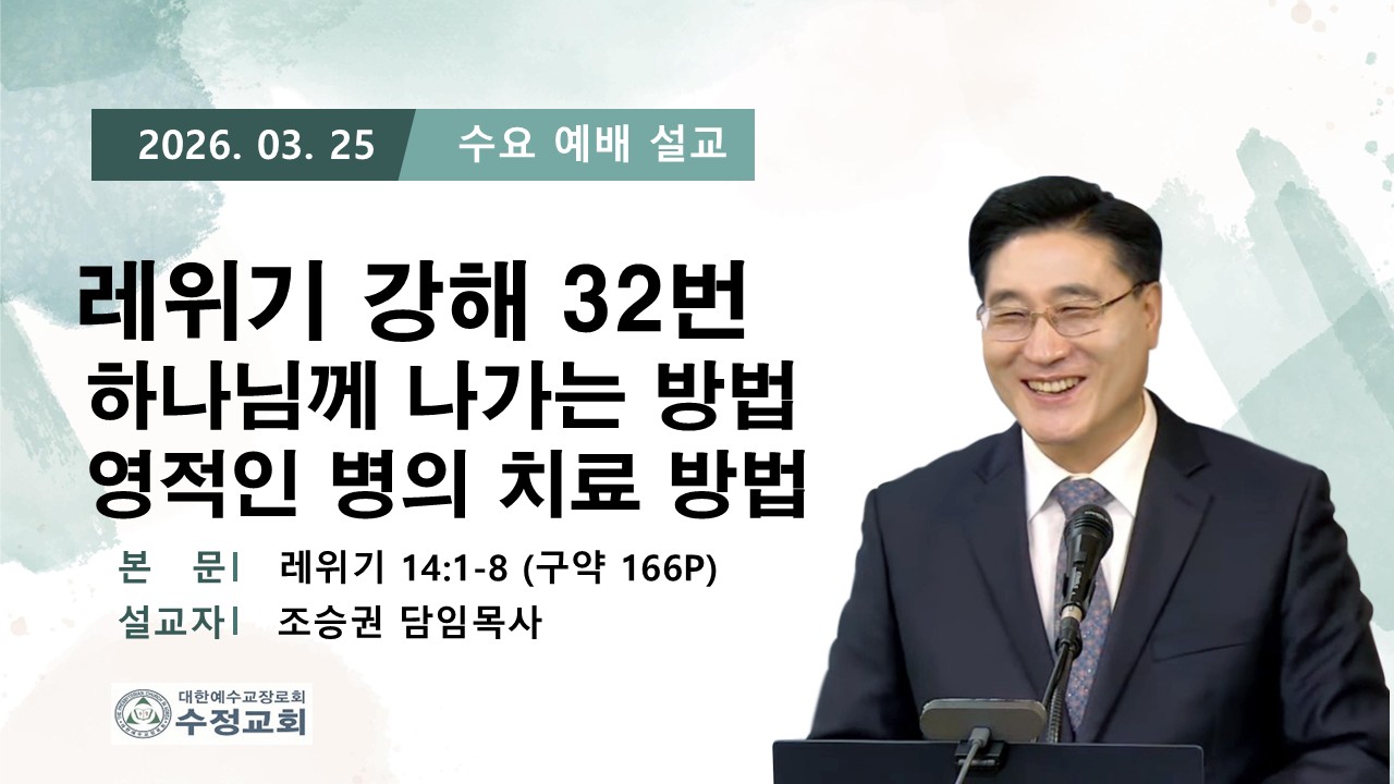 | 2026.03.25 창원수정교회 수요 예배 담임 목사님 설교 말씀 | 조승권 목사님 | 2026-03-25 | |||