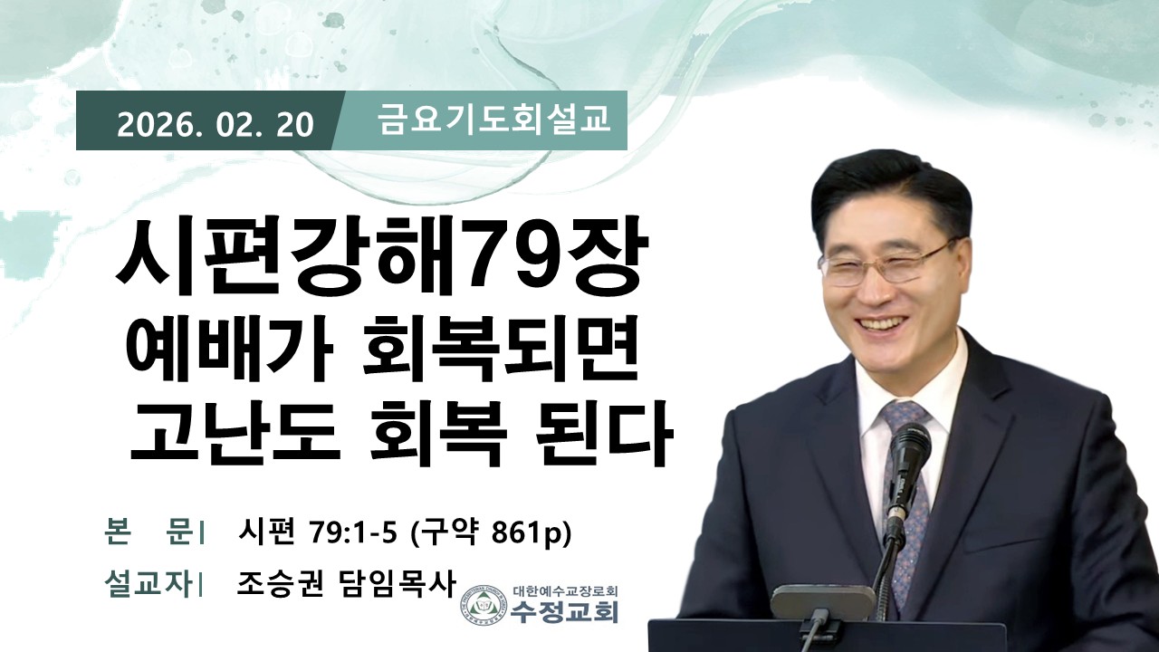 | 2026.02.20 창원수정교회 금요 기도회 담임 목사님 설교 말씀 | 조승권 목사님 | 2026-02-20 | |||