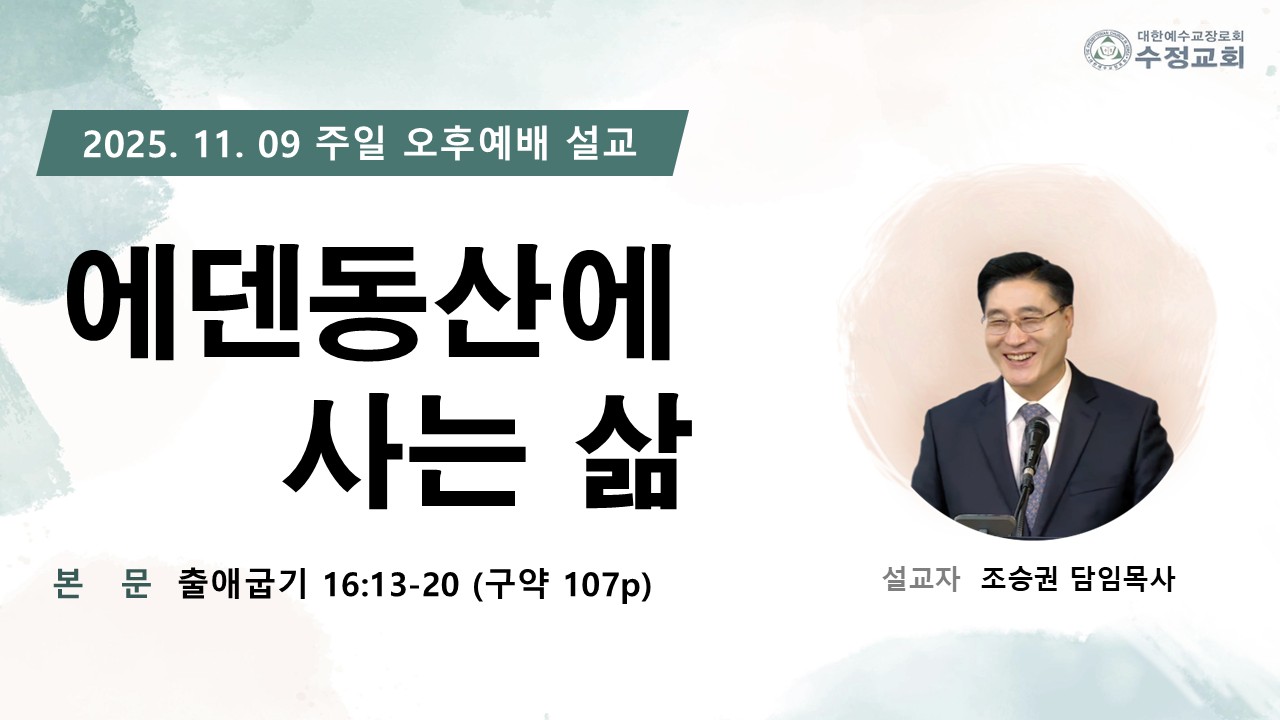 | 2025.11.09 창원수정교회 주일 오후 예배 담임 목사님 설교 말씀 | 조승권 목사님 | 2025-11-09 | |||