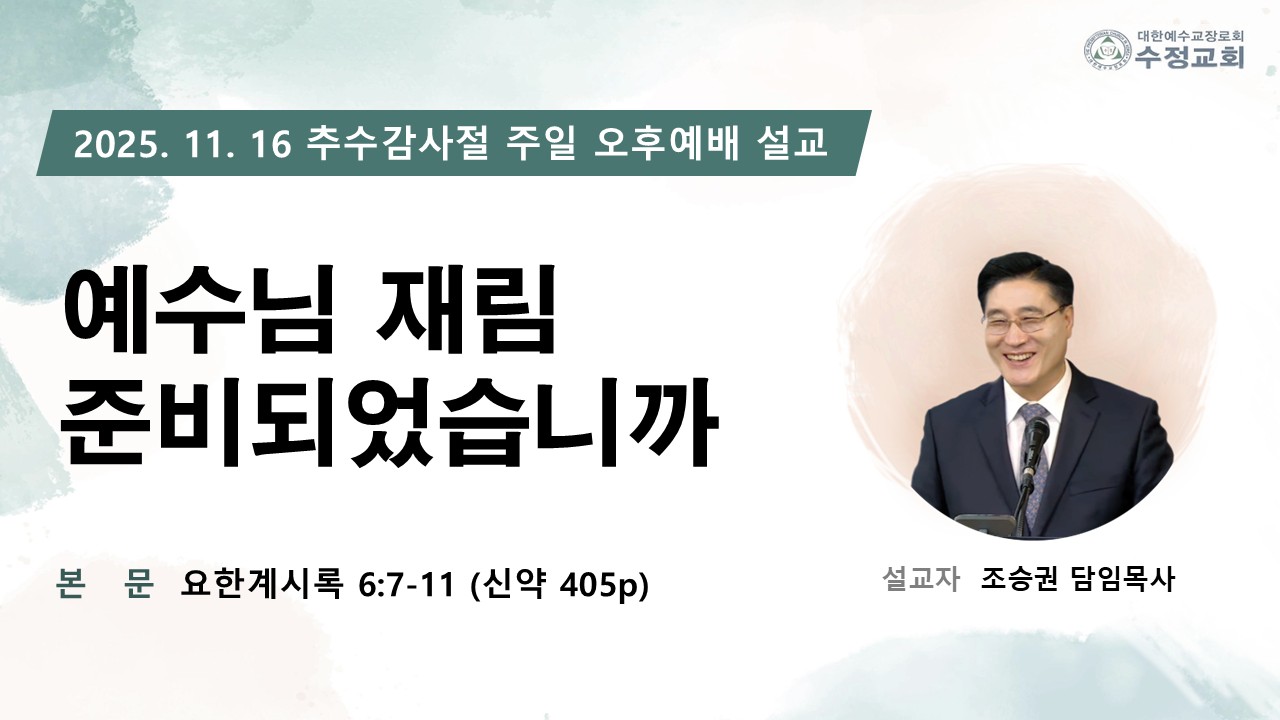 | 2025.11.16 창원수정교회 주일 오후 추수 감사절 예배 담임 목사님 설교 말씀 | 조승권 목사님 | 2025-11-16 | |||