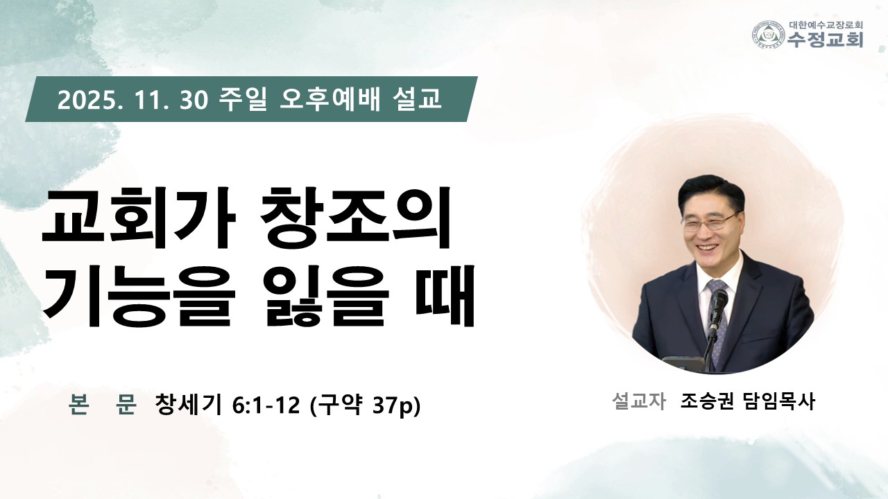 | 2025.11.30 창원수정교회 주일 오후 예배 담임 목사님 설교 말씀 | 조승권 목사님 | 2025-11-30 | |||