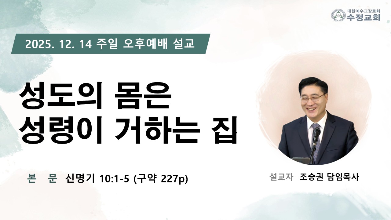 | 2025.12,14 창원수정교회 주일 오후 예배 담임 목사님 설교 말씀 | 조승권 목사님 | 2025-12-14 | |||