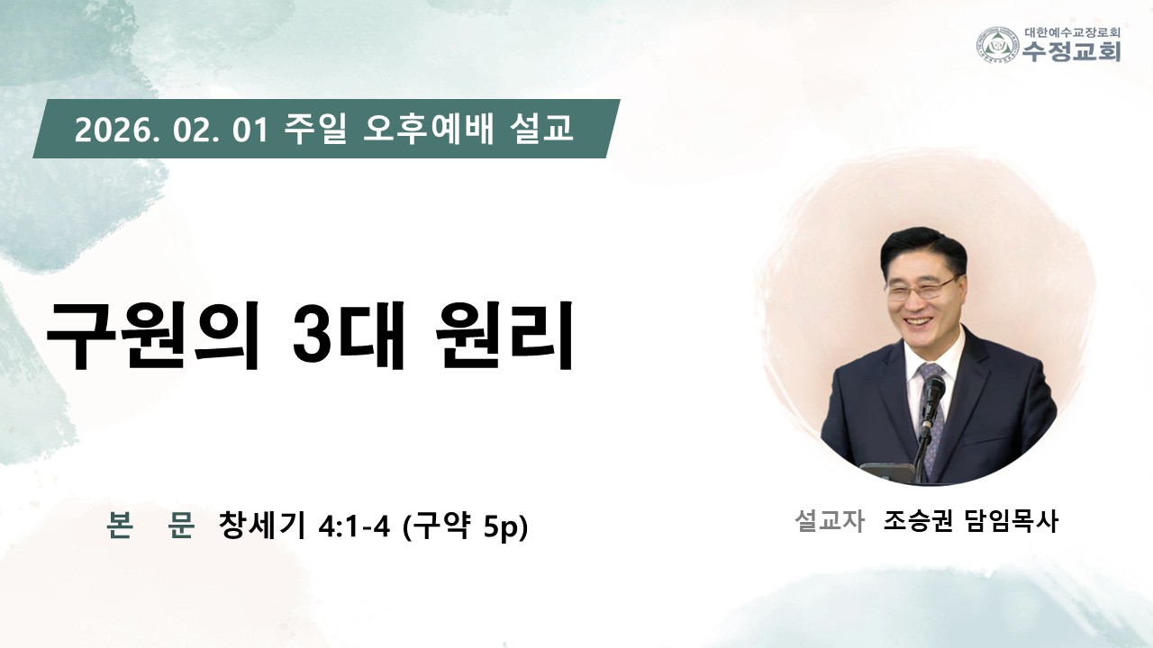 | 2026.02.01 창원수정교회 주일 오후 예배 담임 목사님 설교 말씀 | 조승권 목사님 | 2026-02-01 | |||