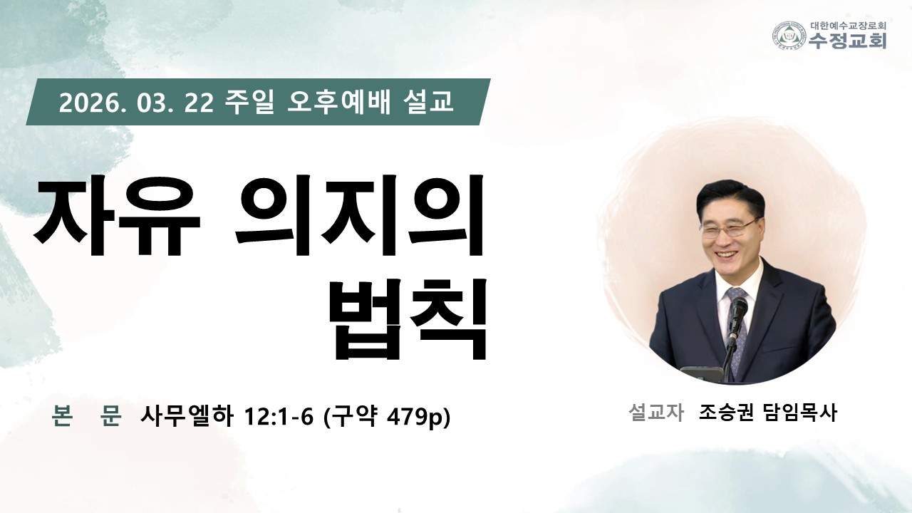 | 2026.03.22 창원수정교회 주일 오후 예배 담임 목사님 설교 말씀 | 조승권 목사님 | 2026-03-22 | |||