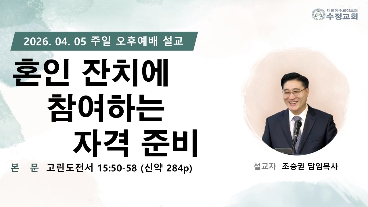 | 2026.04.05 창원수정교회 부활절 주일 오후 예배 담임 목사님 설교 말씀 | 조승권 목사님 | 2026-04-05 | |||
